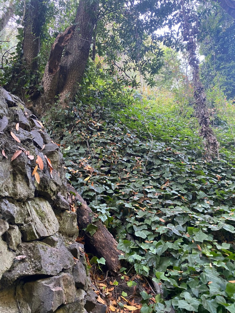 Sausal Creek Ivy League or SCIL is an ongoing project of the Sausal Creek Artist Collaborative. We create art and material culture with English Ivy vines As a means of participating in the healing process the land is going through both by it’s own intelligence as well as through human efforts.